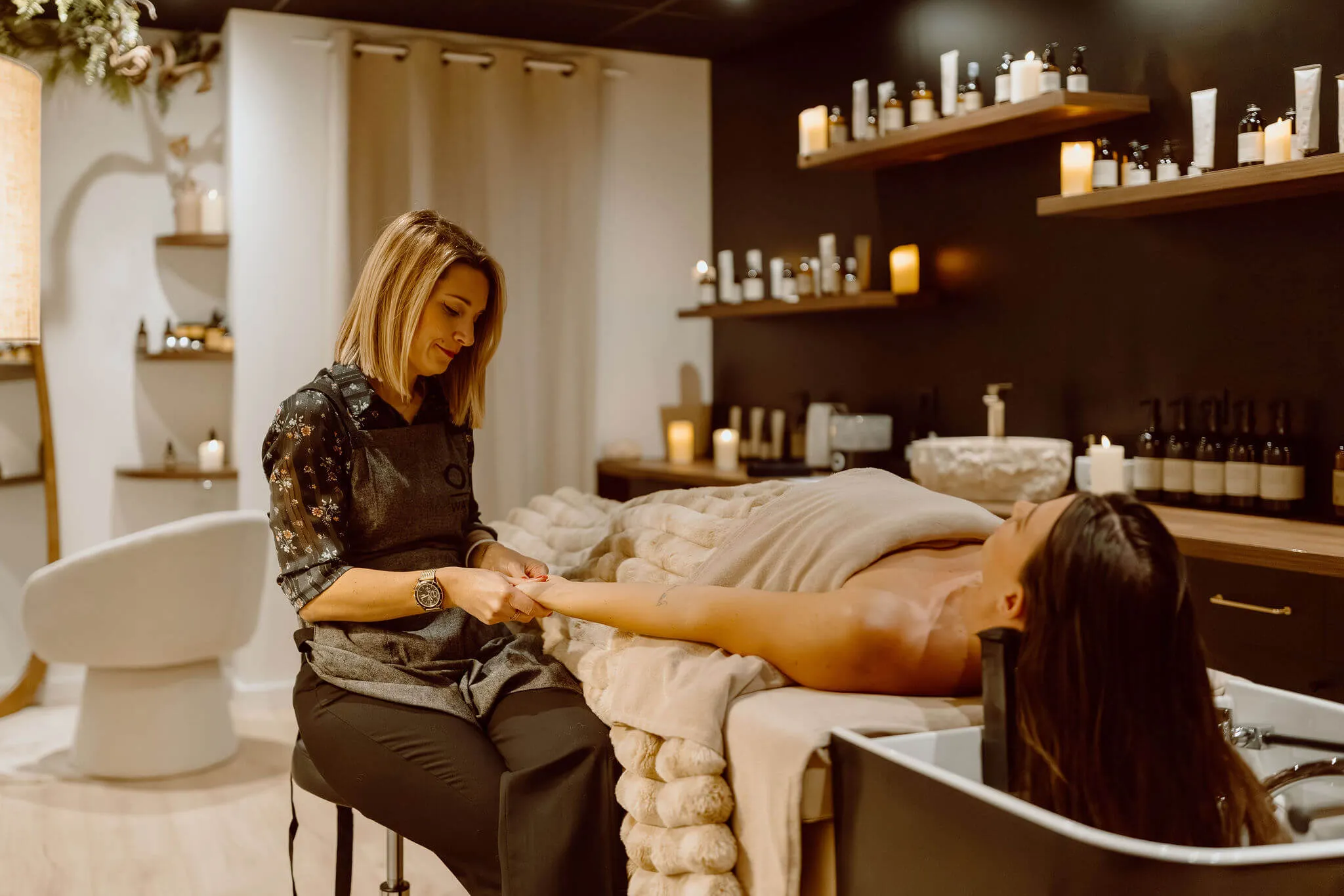 Confortablement installé dans un fauteuil massant, vous vous laisserez emporter par une succession de gestes précis et doux, utilisant des produits naturels et adaptés à vos besoins.