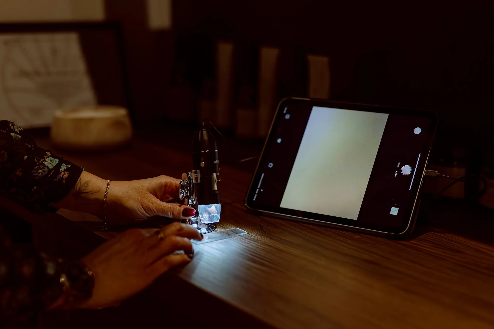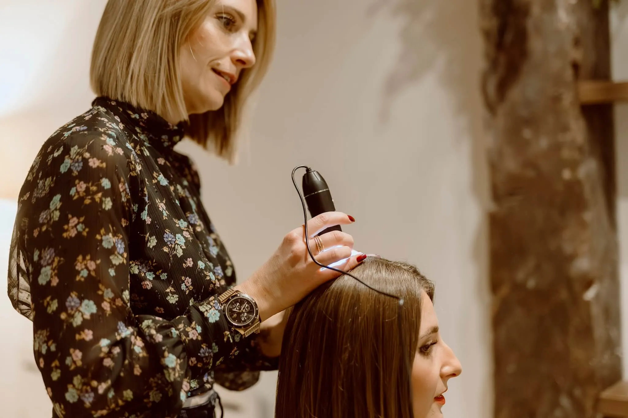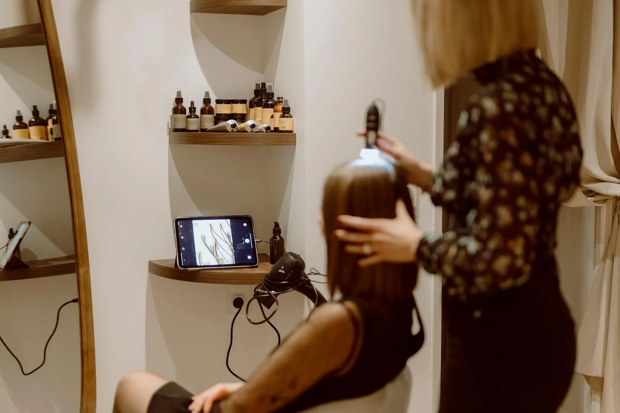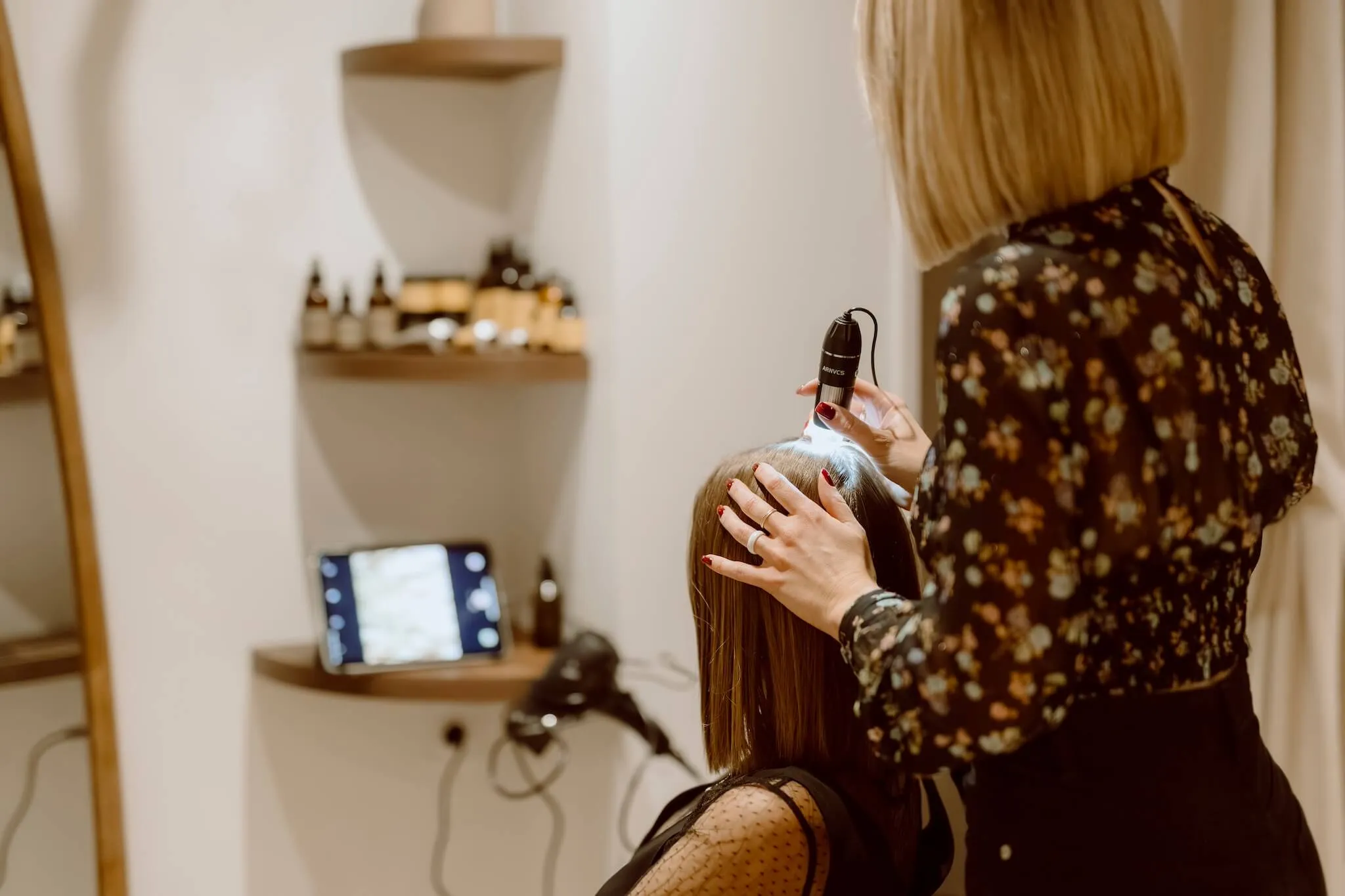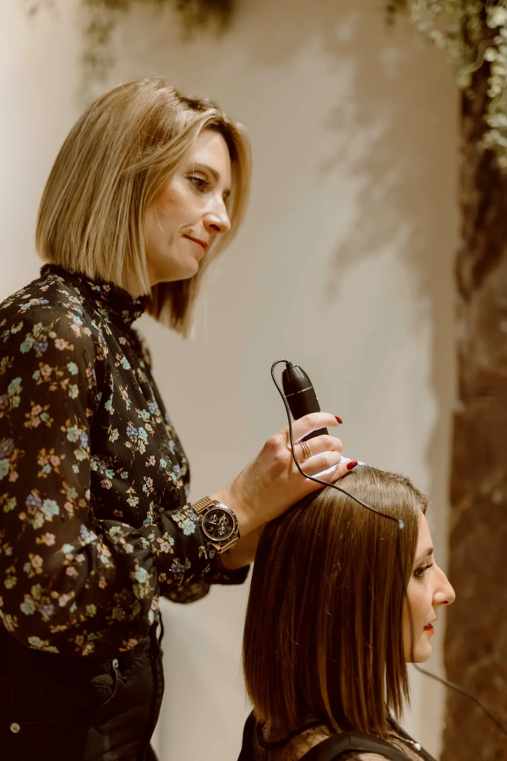 Ce rituel commence par un diagnostic capillaire approfondi réalisé à l’aide d’un outil de haute précision. En analysant la santé de votre cuir chevelu et la structure de vos cheveux, nous pouvons identifier avec exactitude les déséquilibres (sécheresse, excès de sébum, sensibilité, chute de cheveux…) et leurs causes profondes.